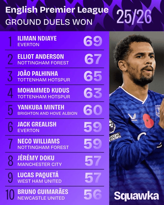 虎扑11月10日讯Squawka统计截至目前英超本赛季赢得对抗(地面争抢/空中争顶)排名。