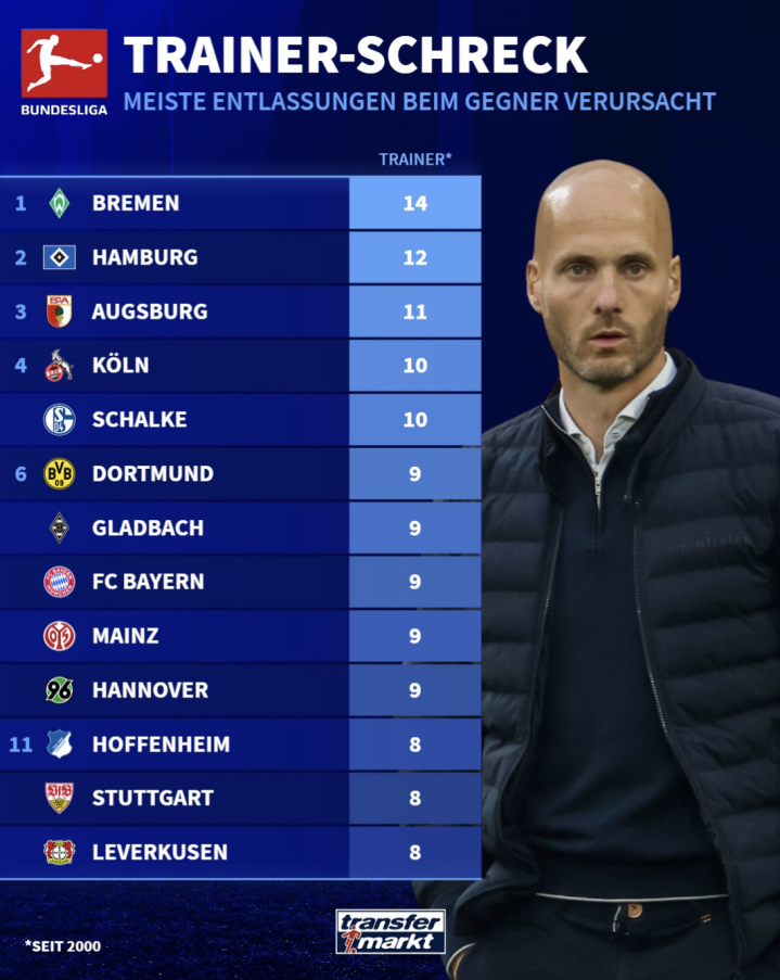 德转统计了本世纪德甲直接导致教练下课的球队排行榜。不莱梅、汉堡和奥格斯堡位居前三。