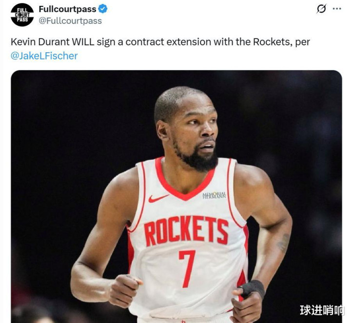 根据《露天看台》名记Jake Fischer报道,杜兰特将与火箭队签下一份提前续约合同。