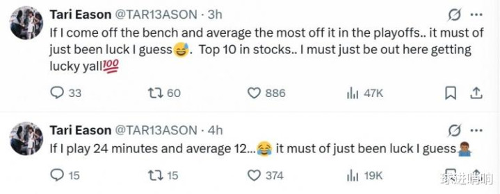 伊森本人也在社媒连续发文:“如果说我场均24分钟可以拿到12分是运气,那么我季后赛作为替补场均得分最高,在抢断和盖帽方面排名前十,可能也都是运气好吧!”